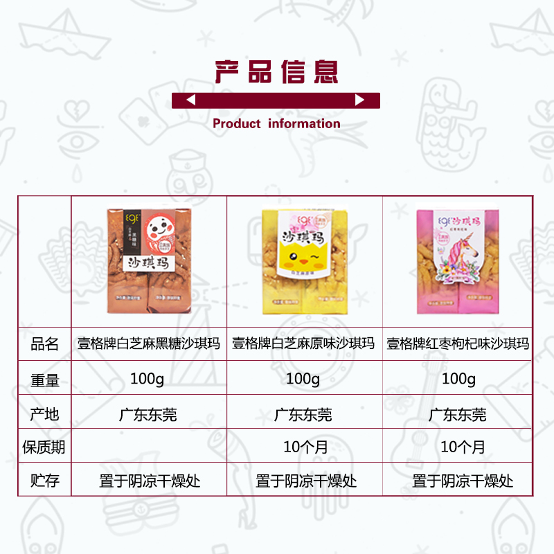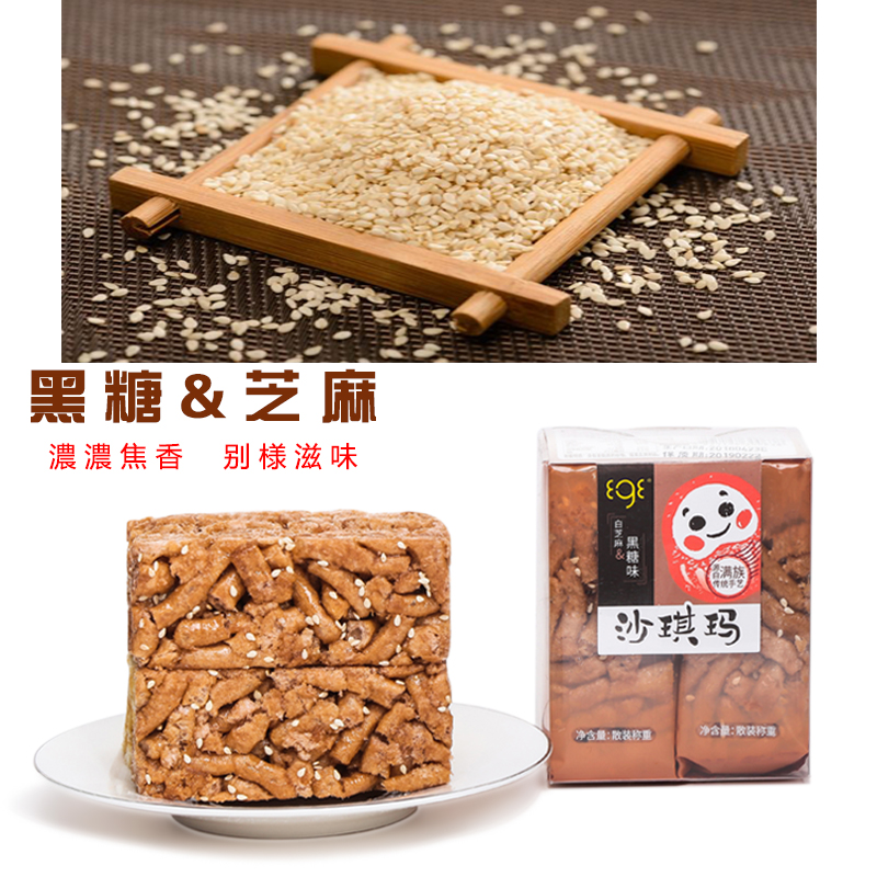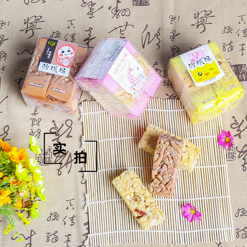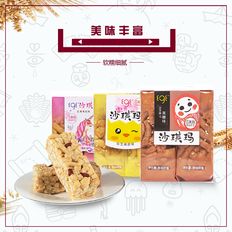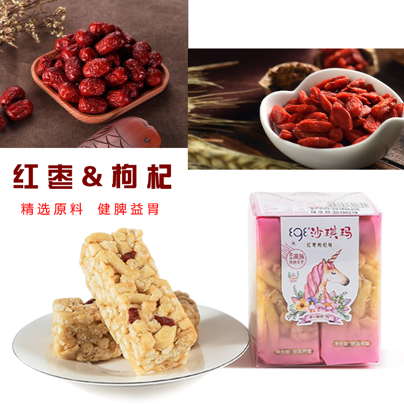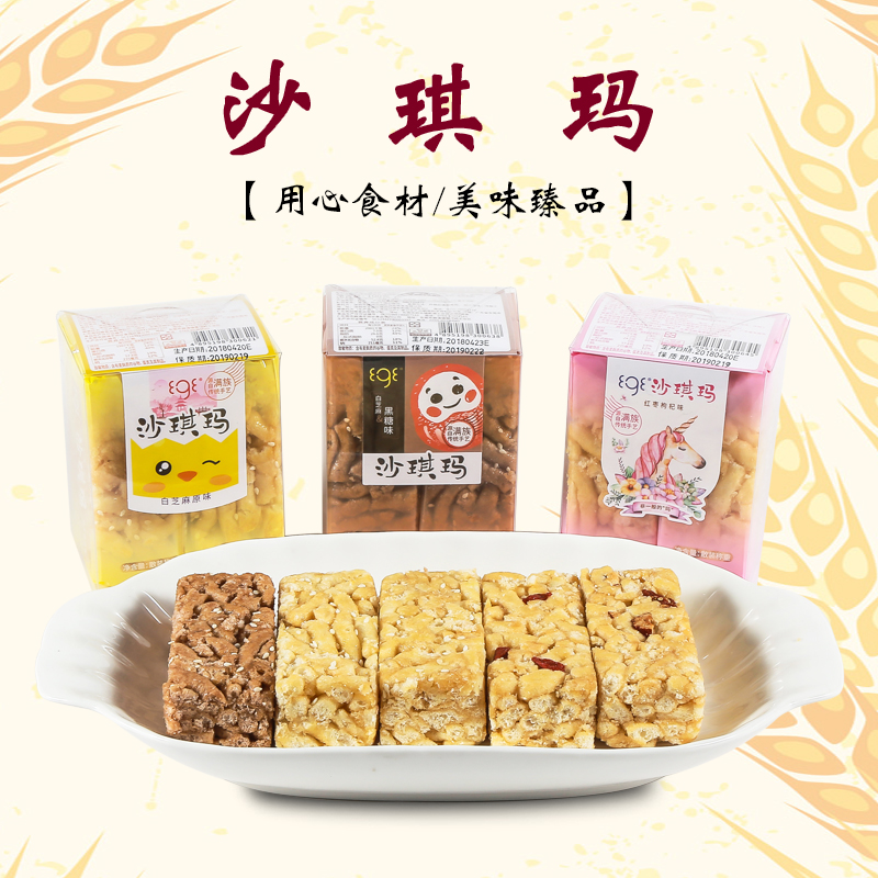 白芝麻原味沙琪瑪、白芝麻黑糖味沙琪瑪、紅棗枸杞味沙琪瑪、