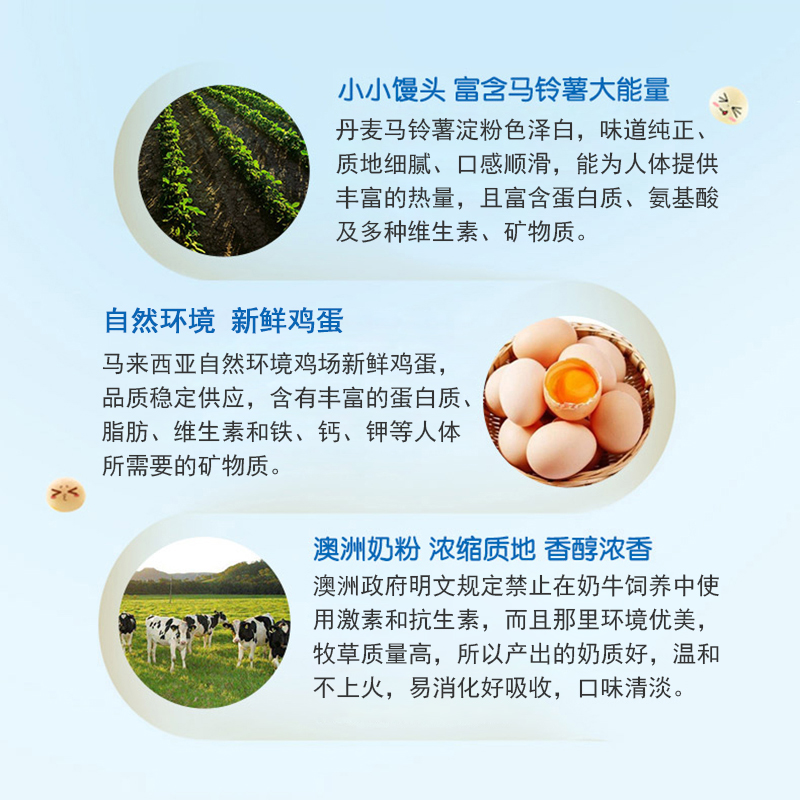 食用馬鈴薯淀粉、白砂糖、雞蛋、乳粉、麥芽糖