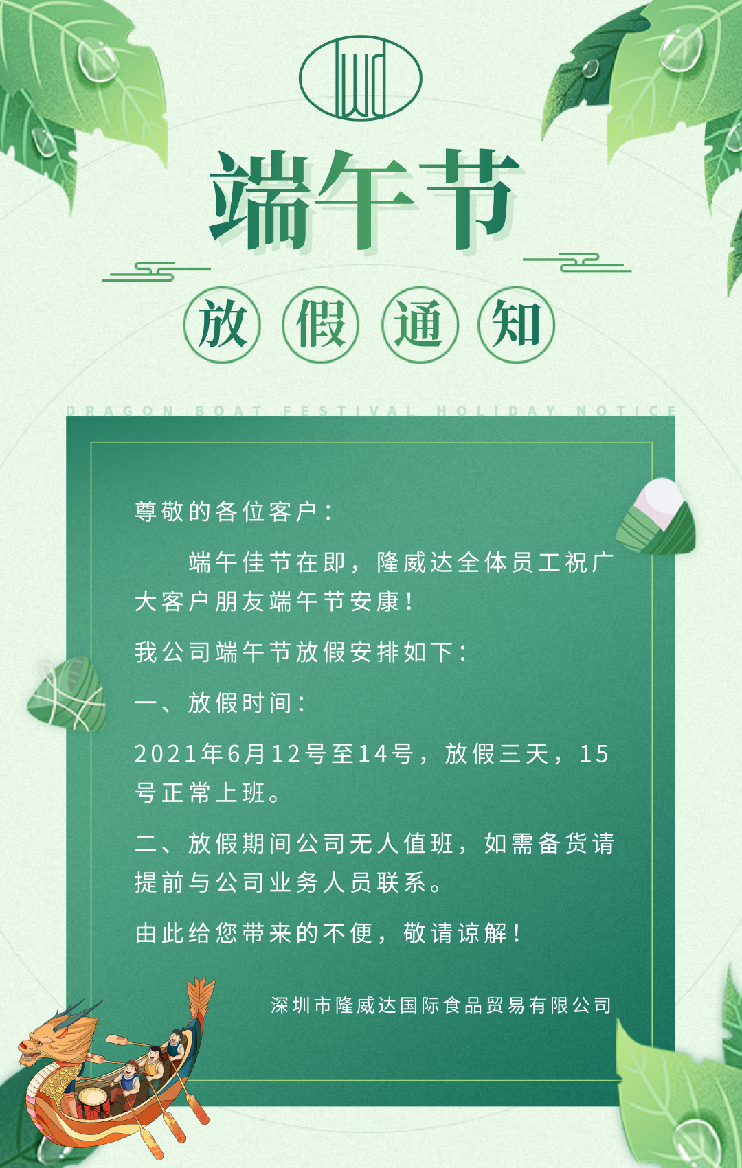 關于2021年隆威達端午節放假安排通知