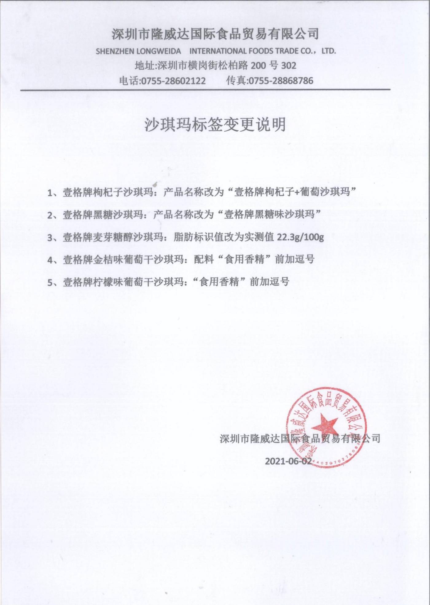 關于本公司司壹格牌沙琪瑪標簽變更說明