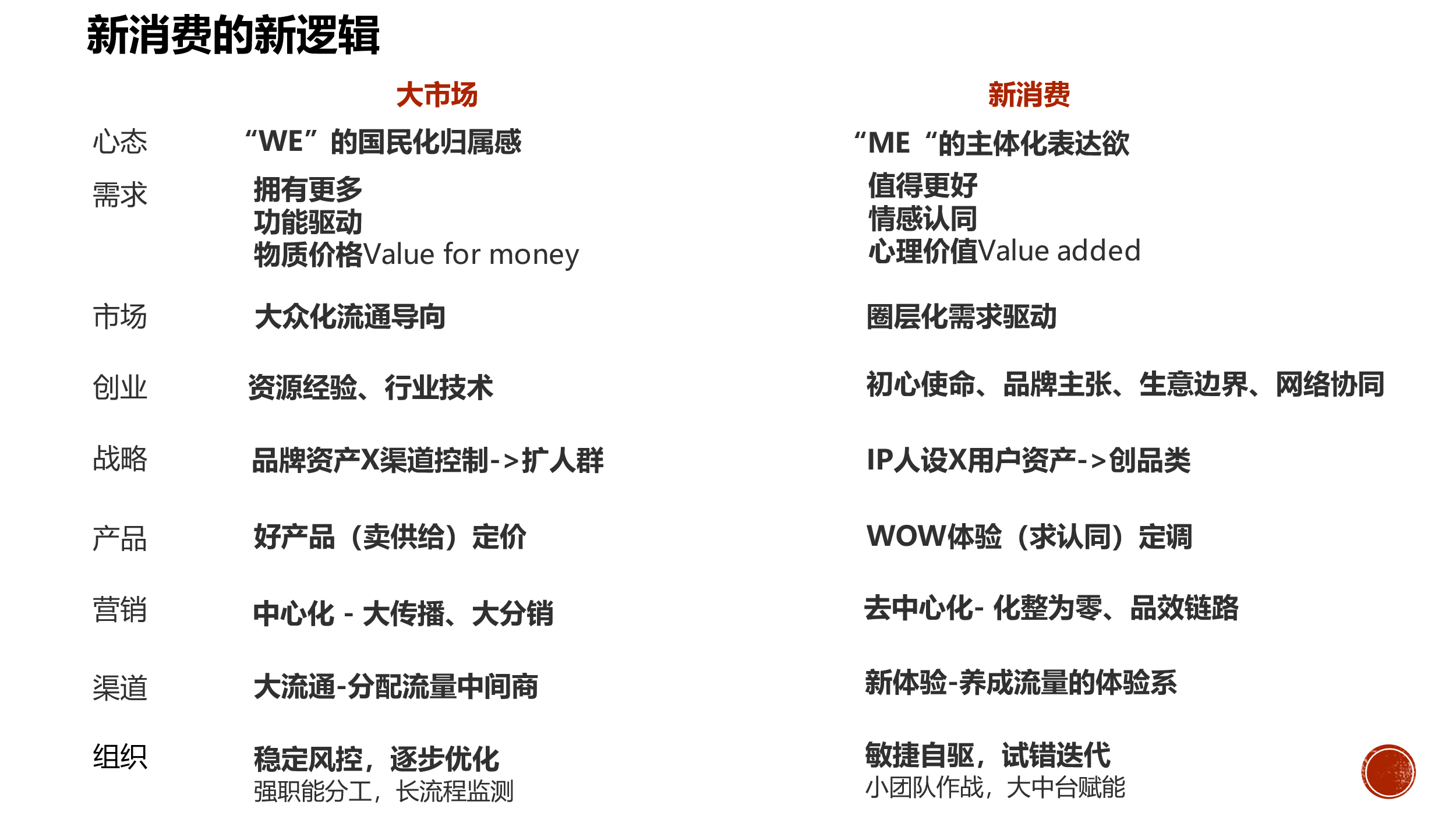 新消費(fèi)和大市場(chǎng)在商業(yè)模式上存在底層邏輯的天壤之別。大市場(chǎng)時(shí)代是產(chǎn)品導(dǎo)向、渠道為王,標(biāo)準(zhǔn)增長(zhǎng)公式為國(guó)民化大單品+洗腦化大傳播+壓貨式大分銷+流量式大出貨,本質(zhì)商業(yè)邏輯是供給重于需求、貨找人的弱關(guān)系觸達(dá)。